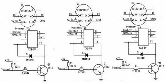 本儀器設計3個通道的二氧化碳傳感器采集,通過3個繼電器來選擇傳感器的通斷。如圖3為繼電器控制電路。