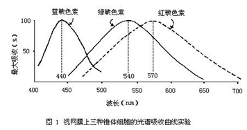當人們做這個實驗的時候,有個驚人的發現,那*是:發現了視網膜上不同的視錐細胞對光譜存在著三種不同的吸收,因而*出現了三種不同的吸收曲線。下面的曲線圖*是其一。只不過是,該圖把三種不同的視錐細胞的光譜吸收曲線畫在同一張圖上了(該圖選自劉家琦,李鳳嗚主編的《實用眼科學》第二版.北京人民衛生出版社,1999年版.第50頁)。這張圖的意思是,用400nm到700nm的色光去單獨照射每個視錐細胞時,其結果是:反射回來的光的數量并不是一樣多,而是有三種。因而,*繪制出了三種不同的吸收曲線圖。并且,這三條曲線各自占據了光譜中的藍區、綠區、紅區的不同位置。因此人們便依據這一點得出了,視網膜接受外界光線刺激時,可以產生出紅、綠、藍三種原色的觀點。